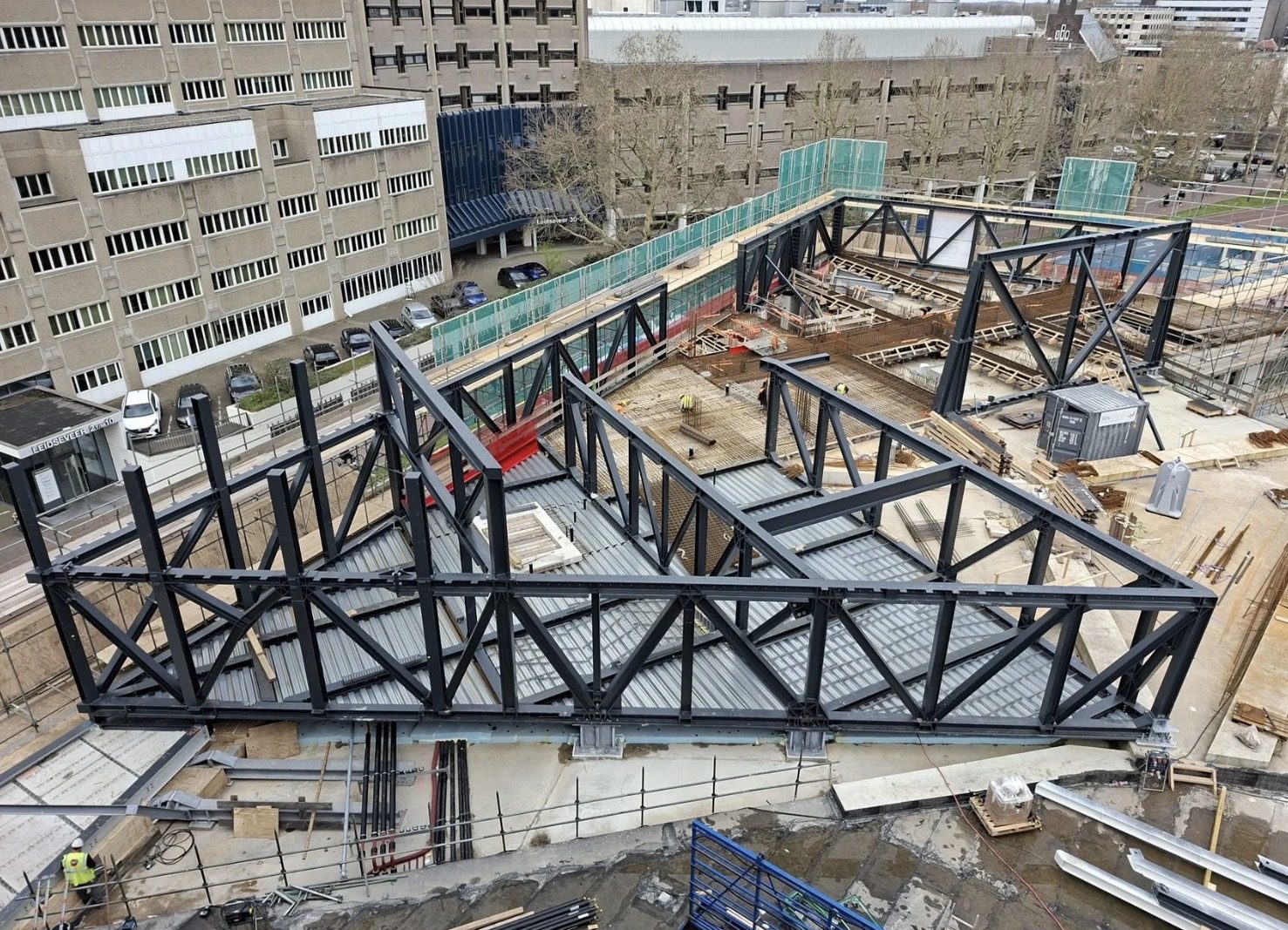 Beide gebouwen worden voorzien van grote stalen spanten. Deze stevige draagconstructies zorgen ervoor dat het dek van de overkluizing – waar straks de bus- en trambaan doorheen lopen – niet extra wordt belast. Met deze stap komt de realisatie van Smakkelaarspark weer een stukje dichterbij!